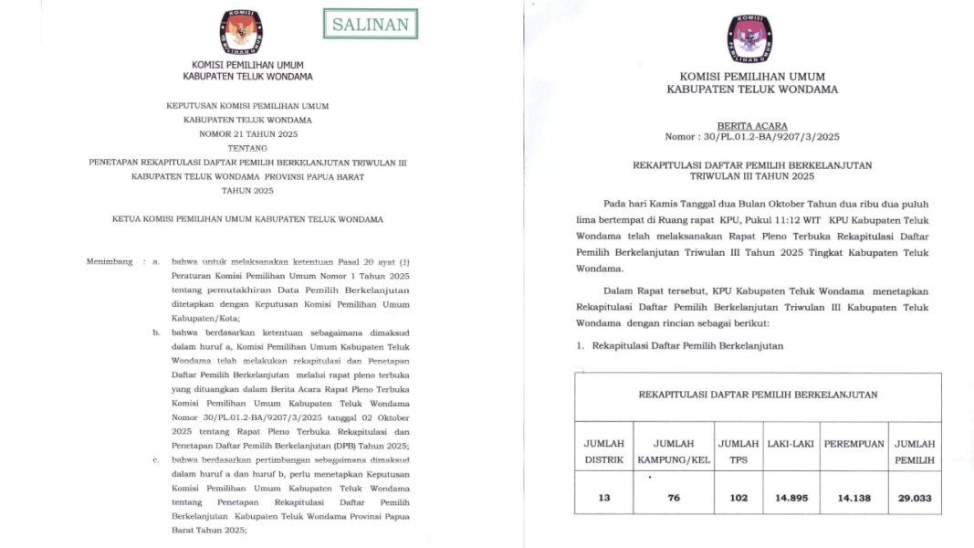 BERITA ACARA DAN SALINAN PENETAPAN REKAPITULASI DATA PEMILIH BERKELANJUTAN (DPB) TRIWULAN III TAHUN 2025 KABUPATEN TELUK WONDAMA PROVINSI PAPUA BARAT