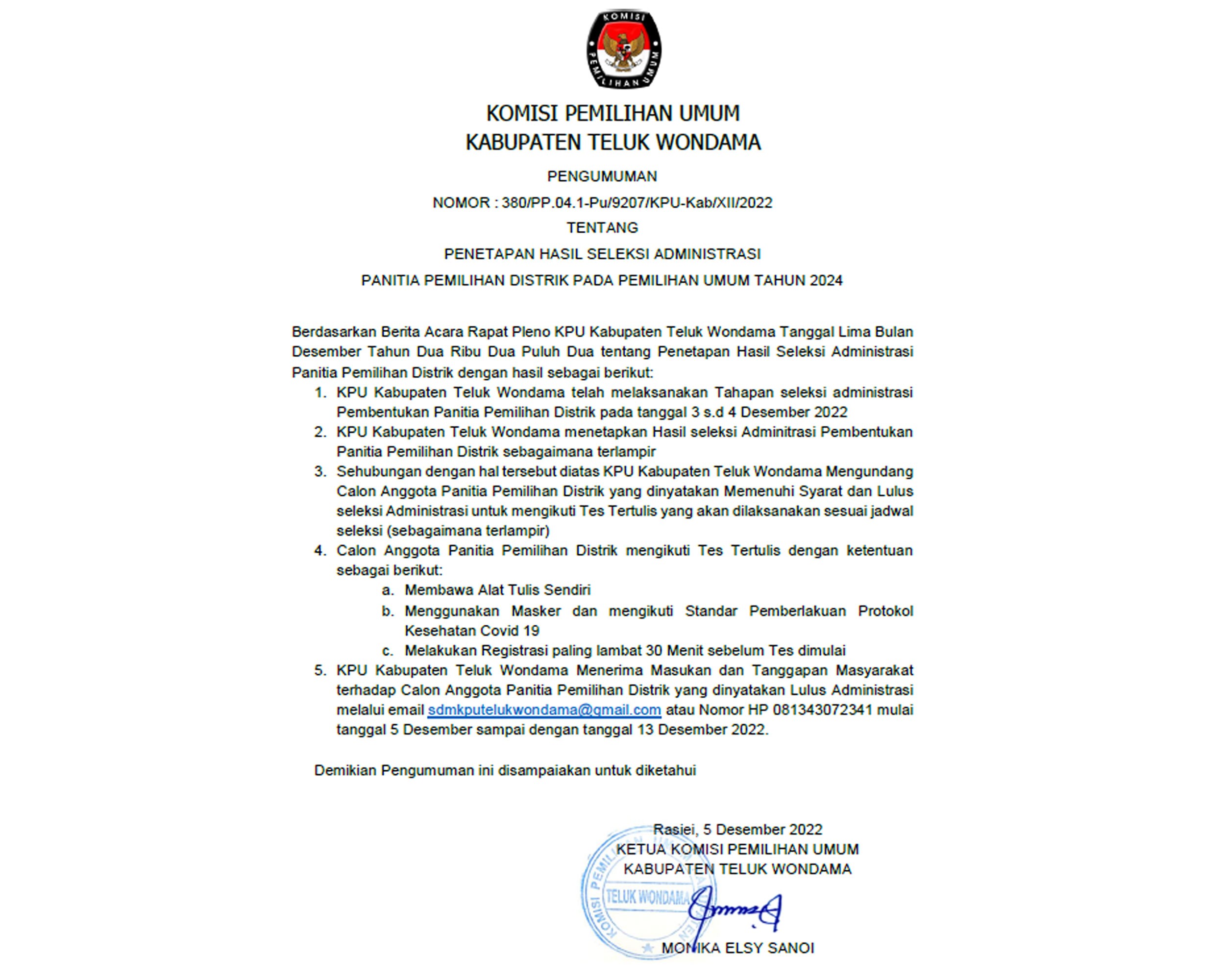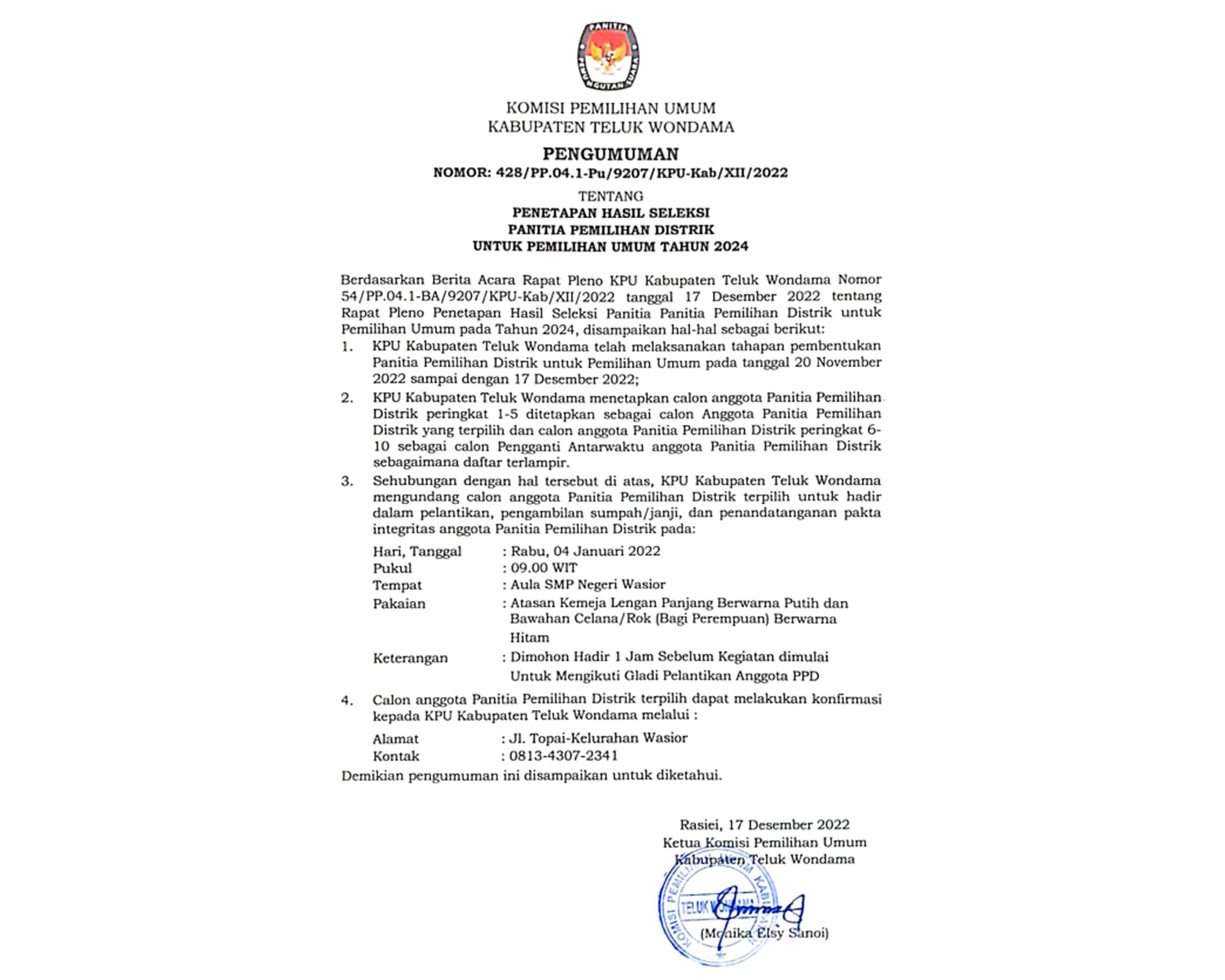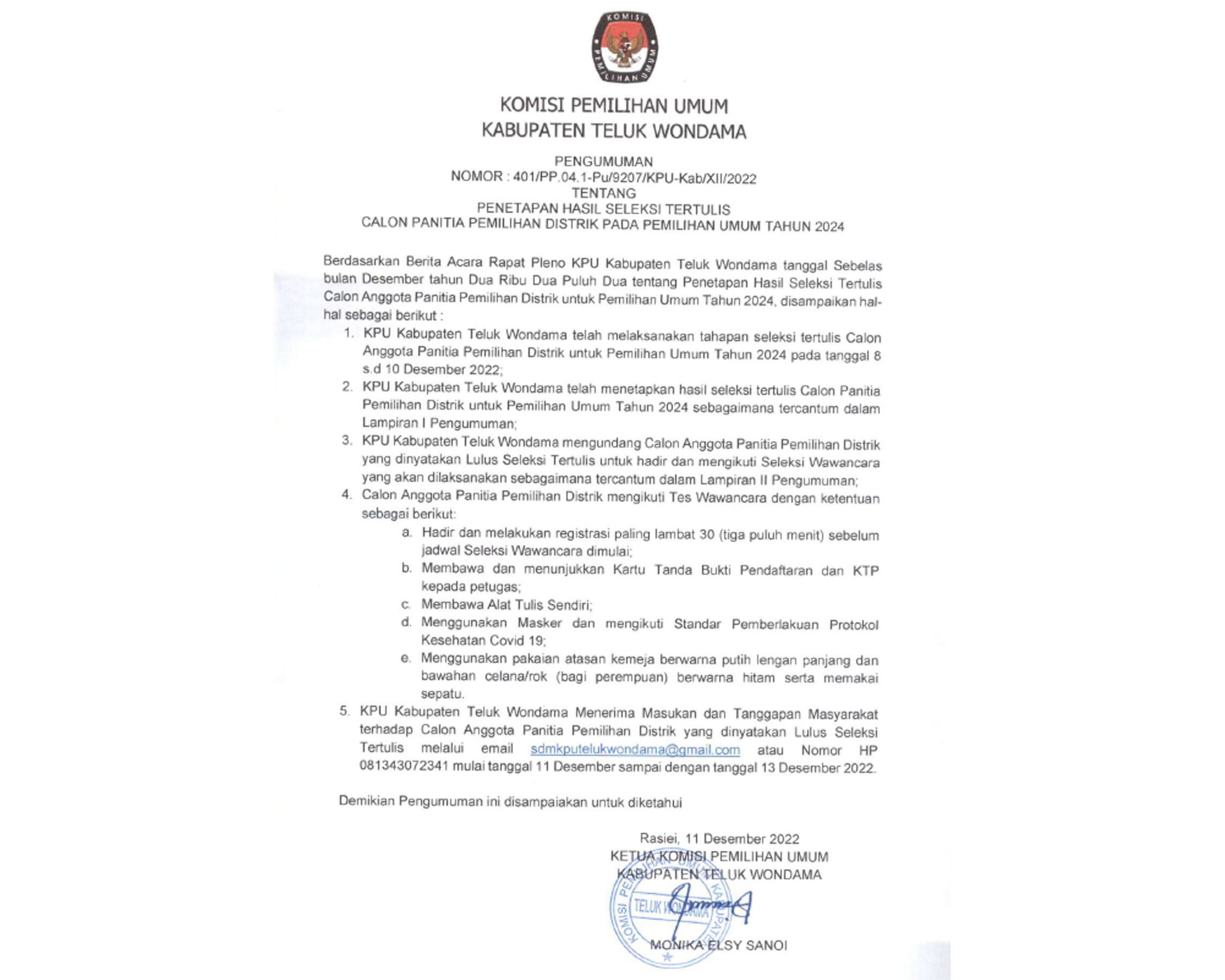 Pengumuman dapat diakses melalui link berikut ini: PENGUMUMAN RANCANGAN DAPIL TELUK WONDAMA PEMILU TAHUN 2024